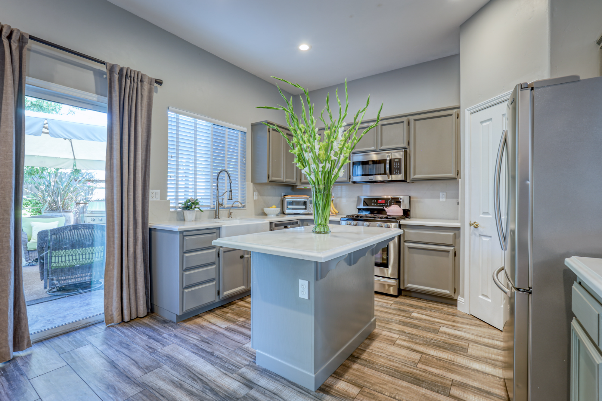 The kitchen has been beautifully remodeled; and boasts grey cabinets, stainless steel appliances, farmhouse sink, quartz countertops that continues into the backsplash to complete the look of this stunning kitchen.