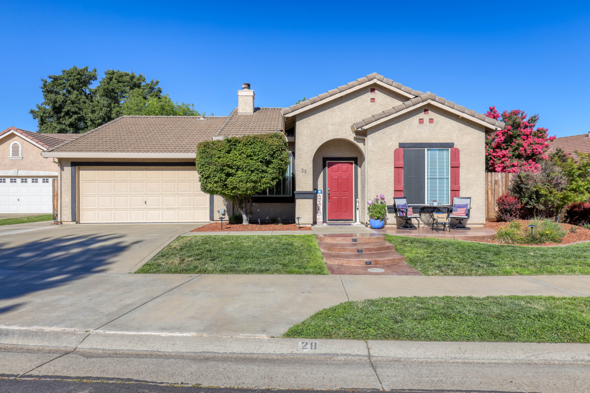 Enjoy the front landscaping that has been tastefully done with stamped concrete stairs with solar lights and drought friendly aesthetics. Sit on the front patio with a glass of wine while socializing with neighbors in this cozy court.
