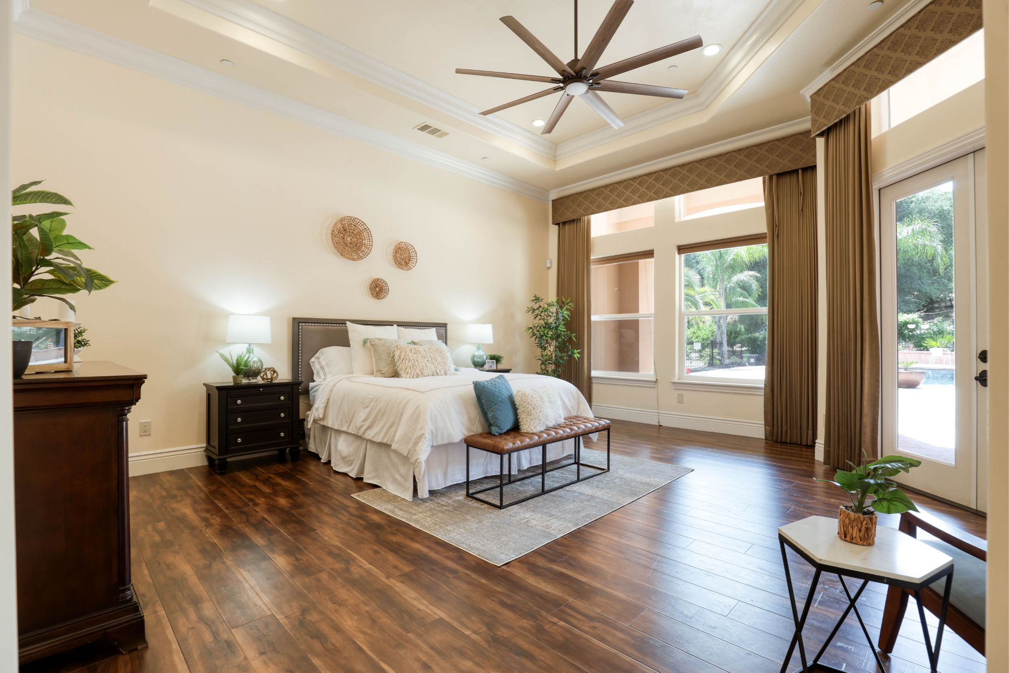 This stunning home boasts unique custom finishes throughout, creating an unparalleled sense of luxury and sophistication. From the 15 foot coffered ceilings to the beautiful herringbone wood plank tile flooring in the living room, no detail has been overlooked.