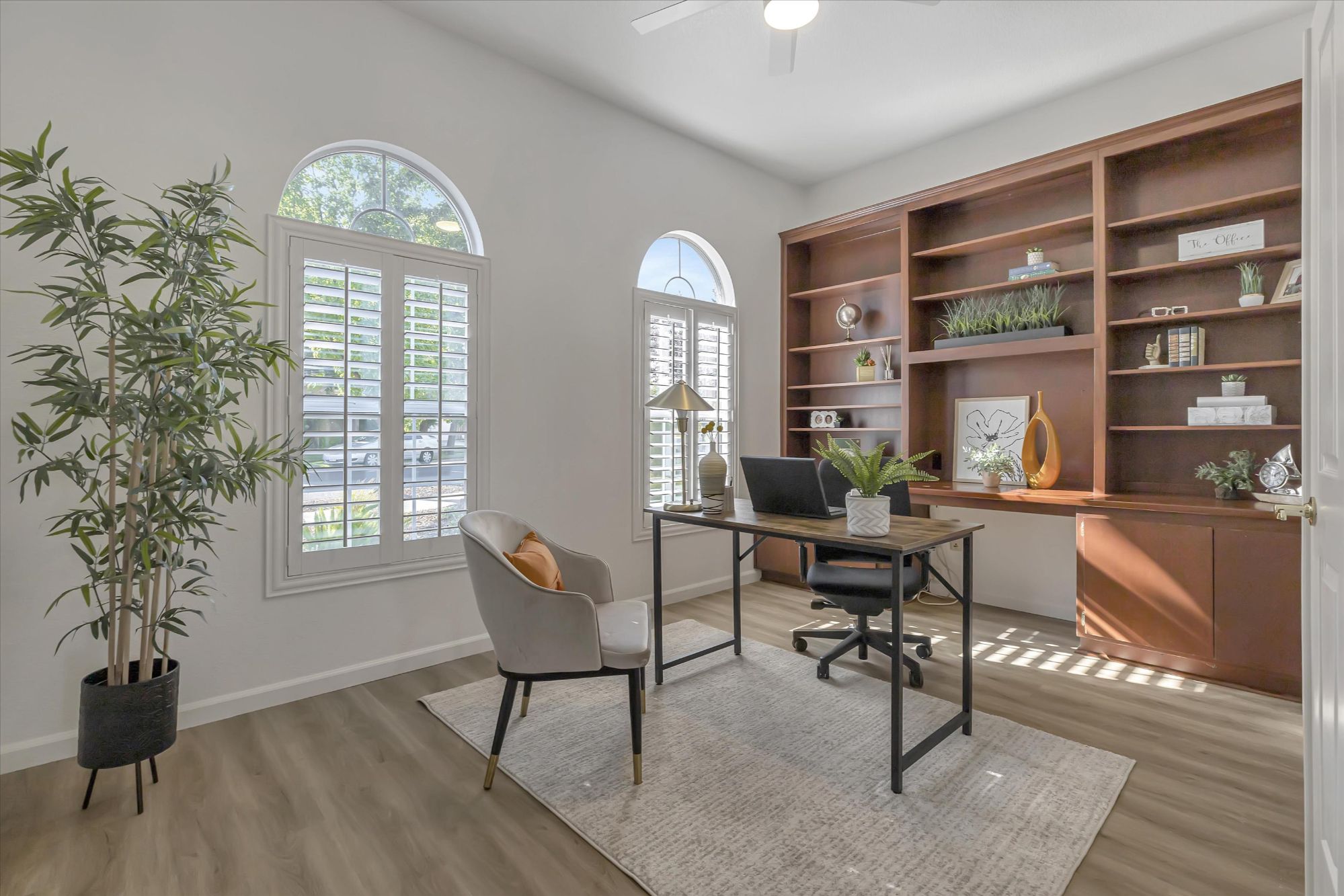 The front room in the house has great potential as a guest bedroom or home office due to its seclusion from the rest of the bedrooms. The space is enhanced by plantation shutters and built-in bookshelves, making it perfect for work or relaxation.
